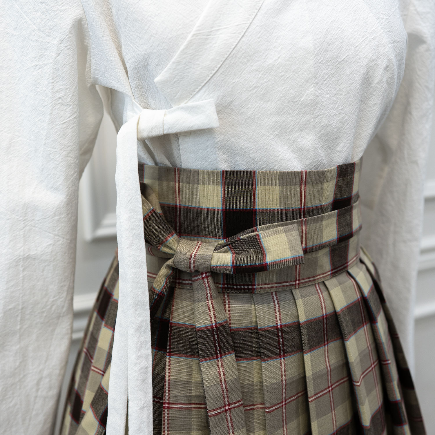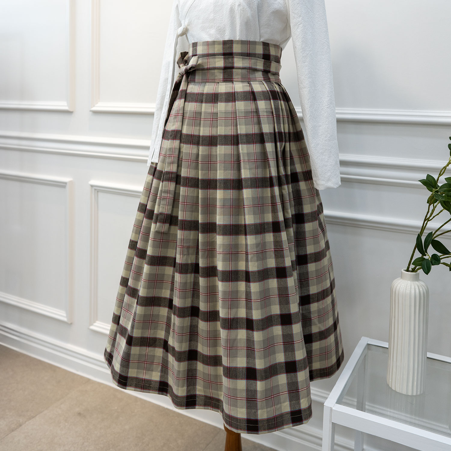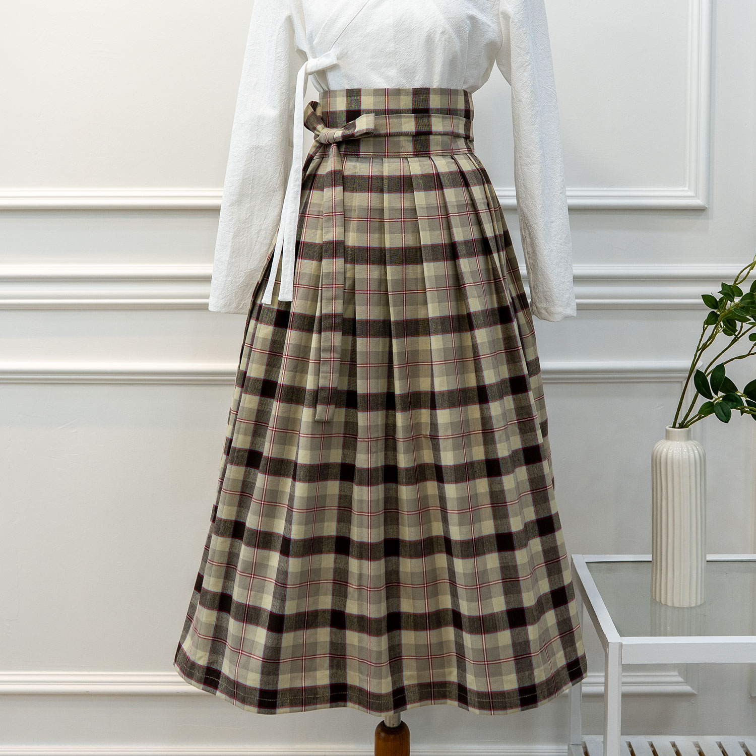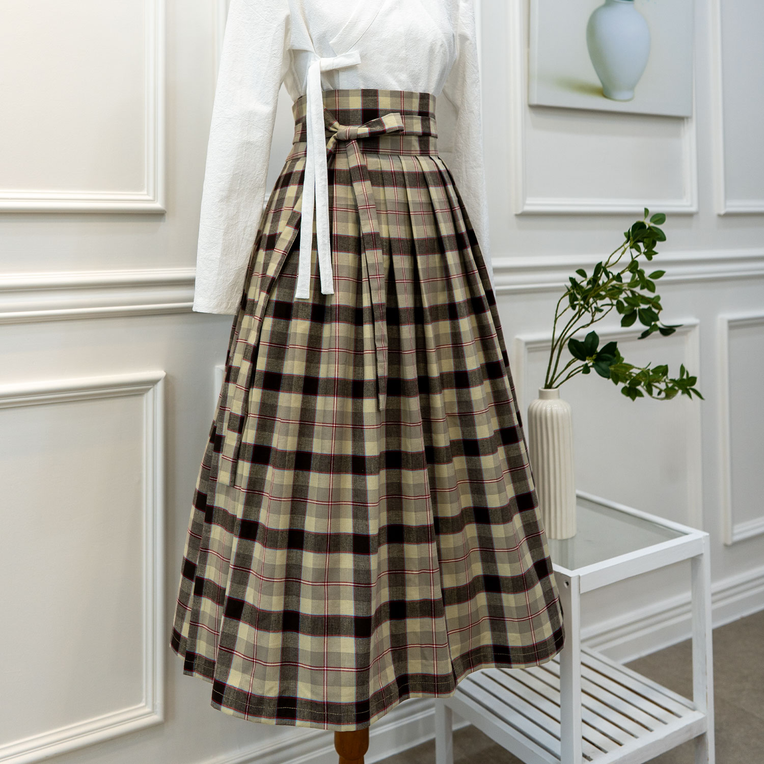 위에서 아래로 흐르는 선율, 반듯하게 배열된 체크무늬, 한복 저고리가 아닌 일상복과도 무난하게 매칭되는 허리치마 입니다.