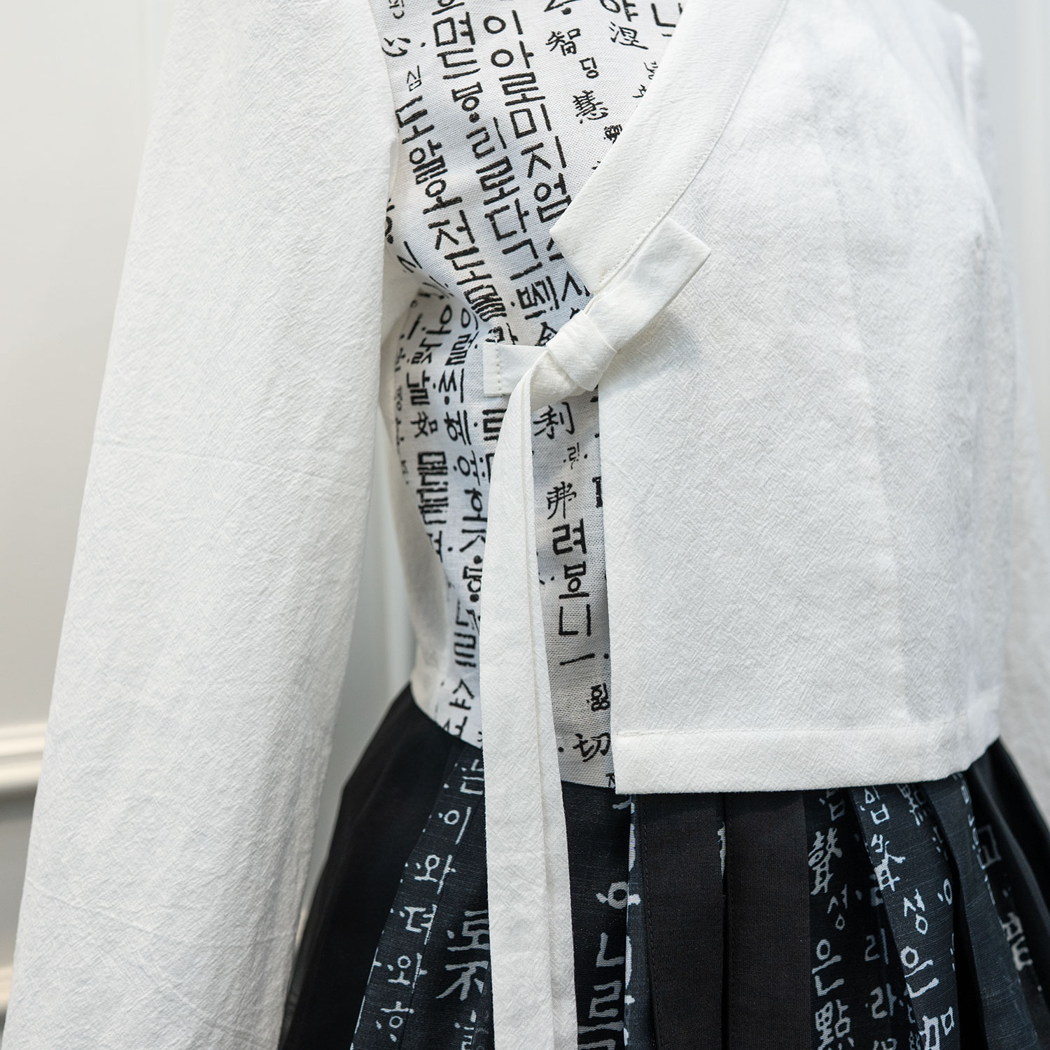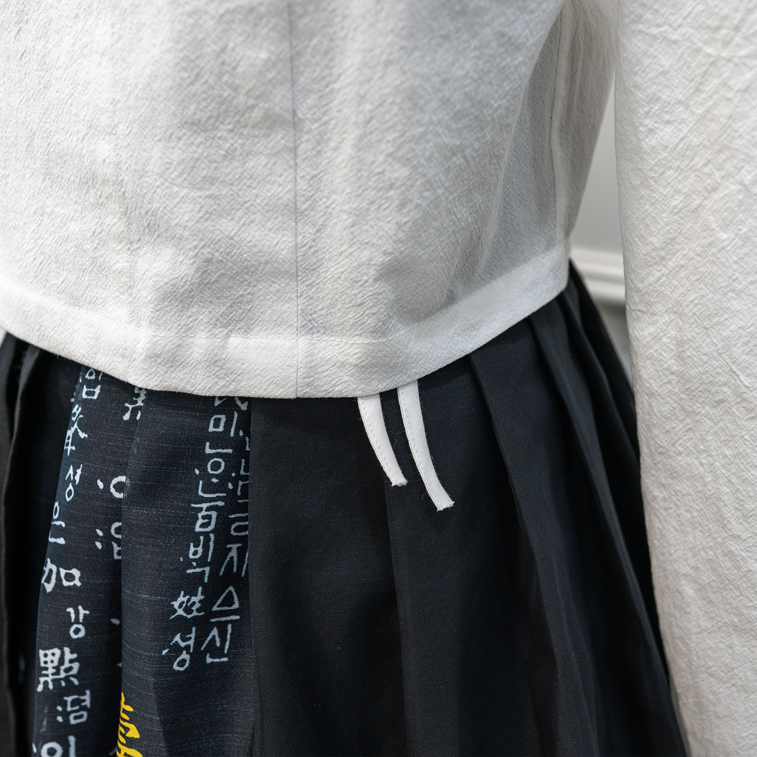 저고리는 흰색 원단으로 단아하면서도 우아한 풍미를 풍기며, 치마는 검은색으로 흰색 저고리와 명확한 대비를 이루어 반듯하고 흐트러짐 없는 모습을 갖춥니다.