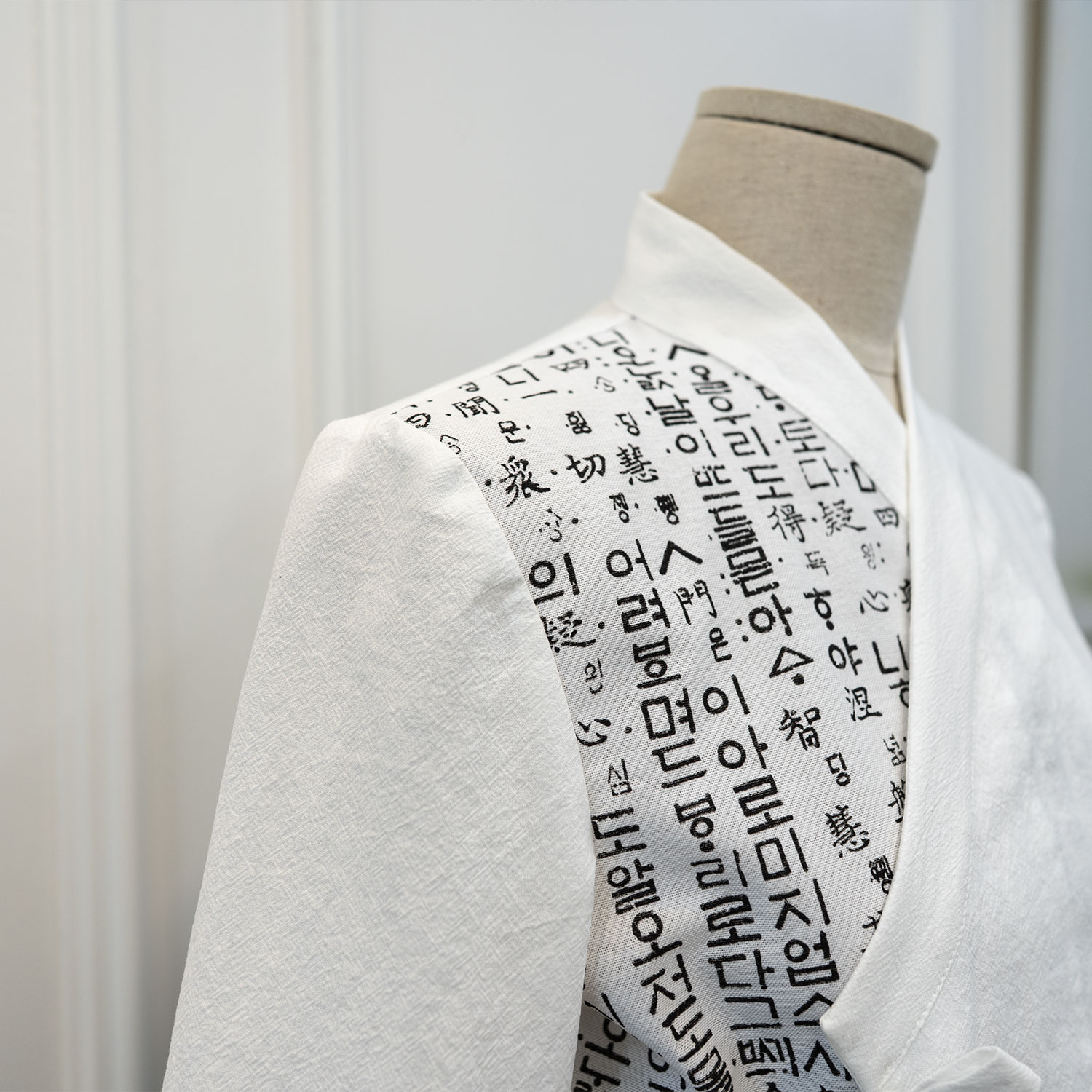 한글의 아름다움을 한복에 매치하여 상의와 저고리와 치마를 디자인했습니다.