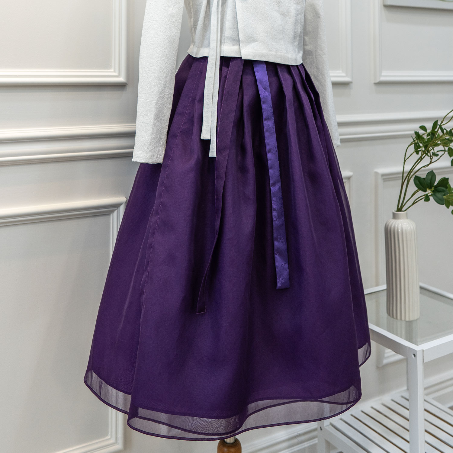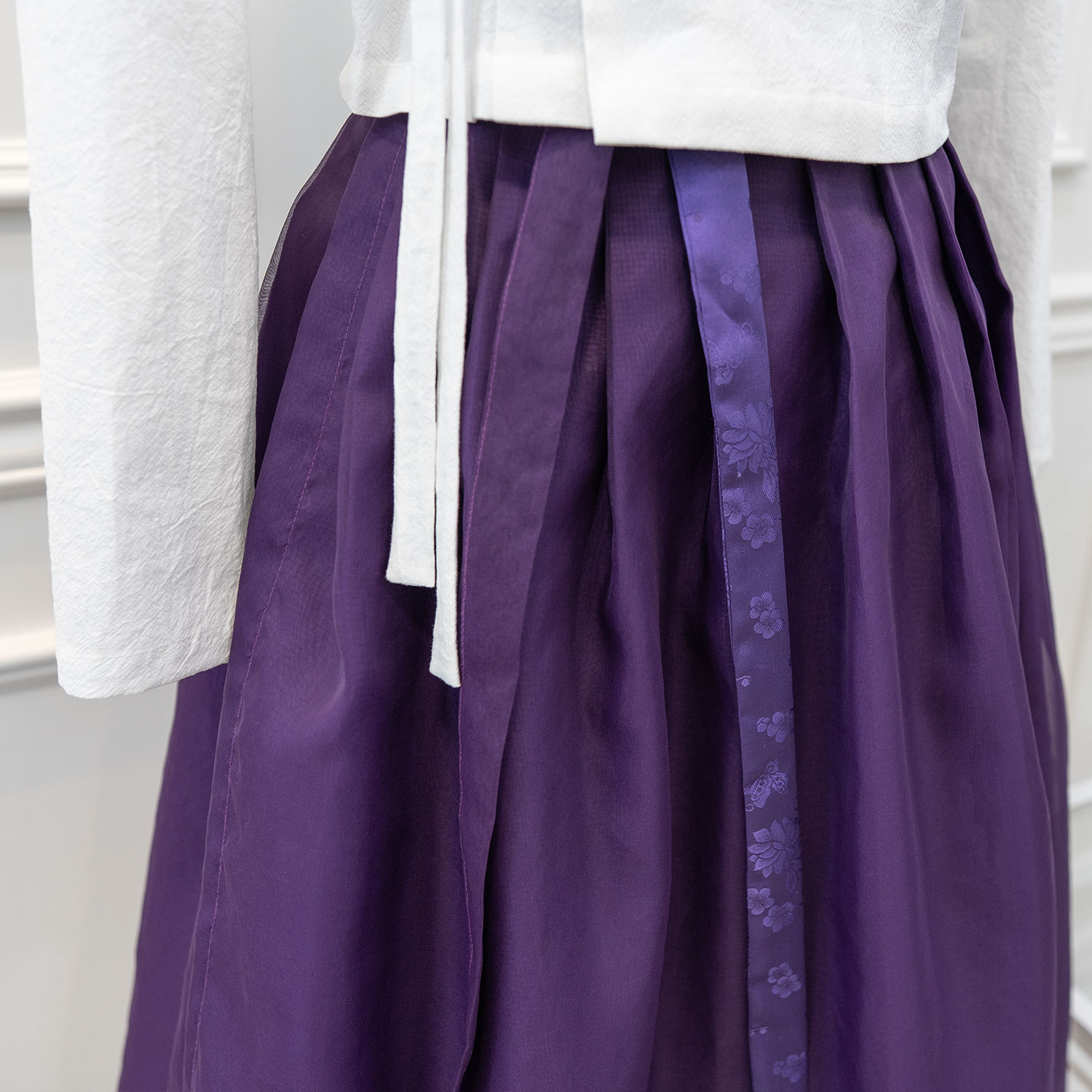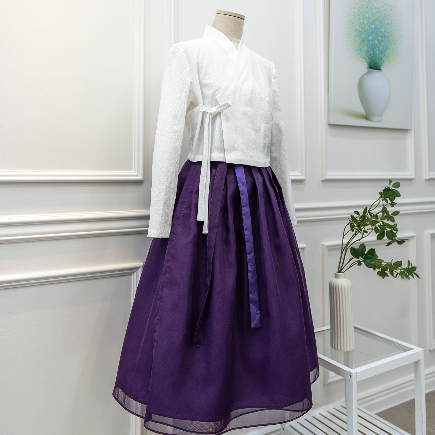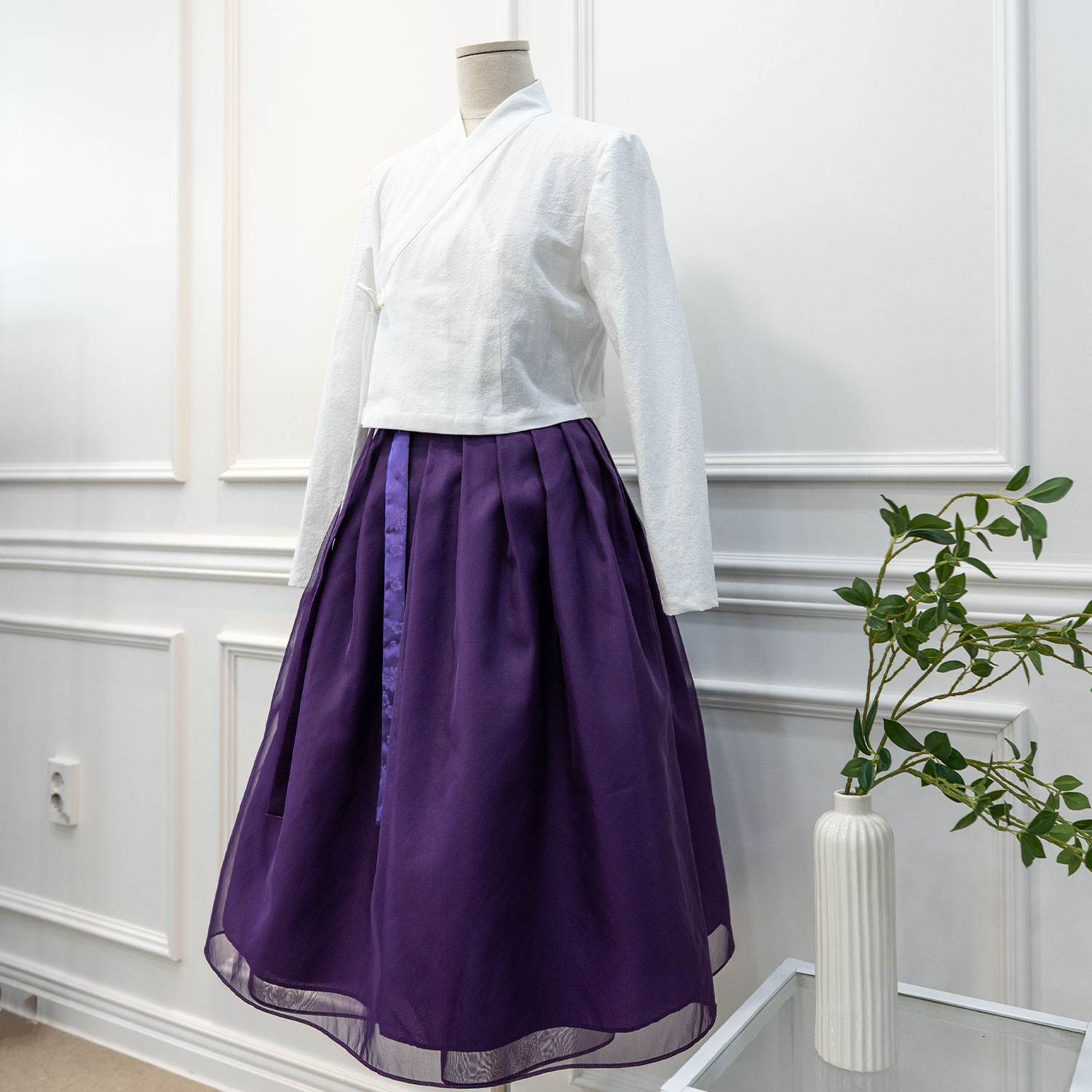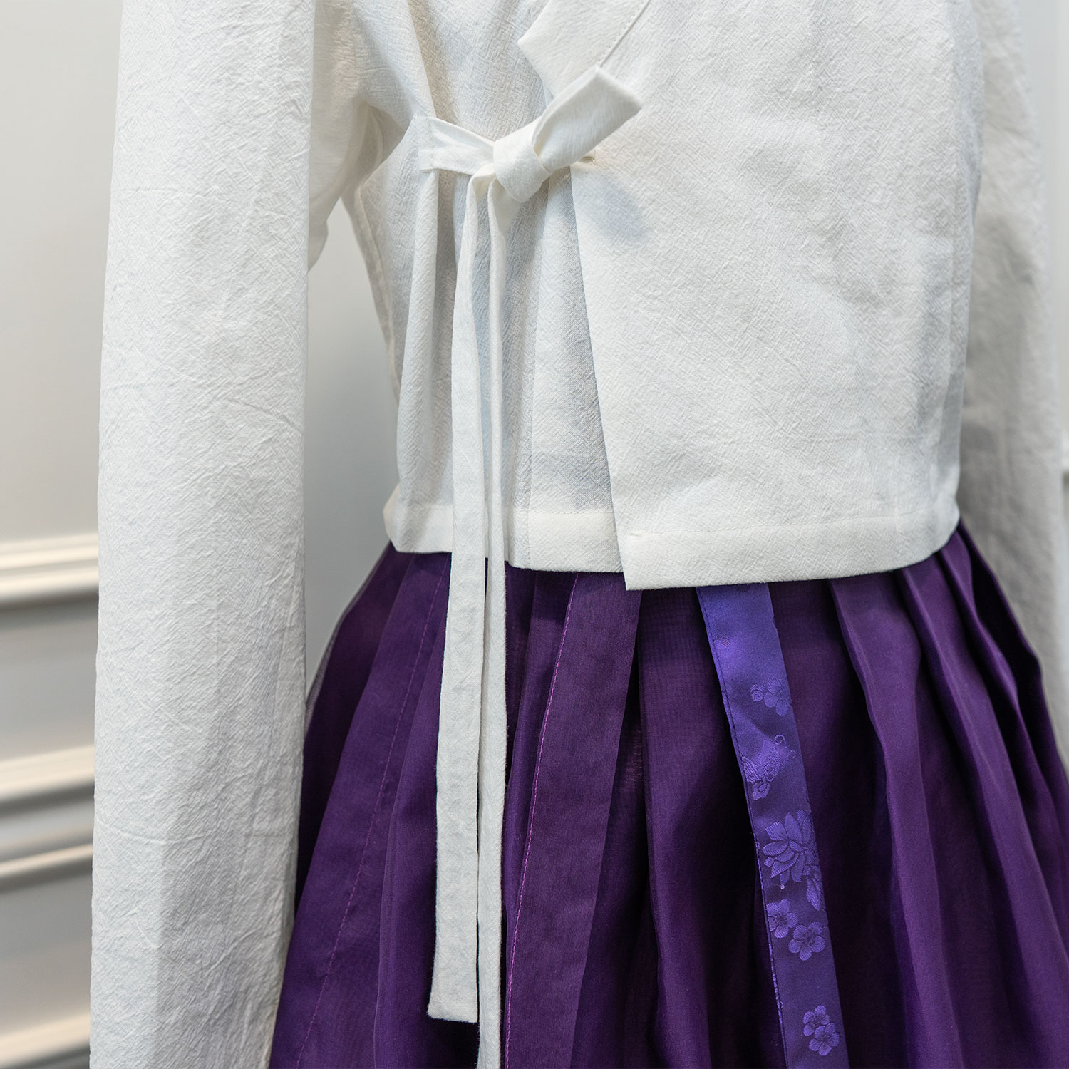 저고리는 깔끔한 무지 원단으로 고급스러움을 풍기며, 치마도 같은 무지 원단으로 단순하면서도 정갈한 이미지를 만들어줩니다.